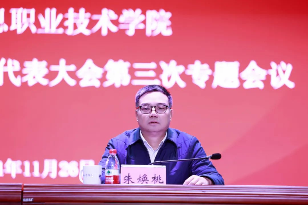 他强调,要统一思想,提高站位,凝聚创新发展强大合力。围绕立德树人根本任务,以培养应用型人才为核心,全面提高人才培养质量。不断提升服务区域发展和国家战略的能力,为加快建设教育强省、谱写中国式现代化建设贡献学院力量。要履职尽责、建言献策,提升服务教职工的能力。充分发挥桥梁纽带作用,深入教职工,及时了解他们的所急所需,着力解决他们最现实、最直接、最关心的问题。学院工会要深化服务意识,聚焦民生实事工程,全面发挥竭诚服务教职工的职能作用,不断提升教职工的幸福感、安全感和获得感。要服务大局,担当作为,增添高质量发展动力。代表作为学院发展的关键,担当发展重任,应紧扣中心工作,传达会议精神;应聚焦大事干实事,提升学院影响力;应提升教学质量与科研水平,深化教改,服务社会与地方经济发展。学院院长朱焕桃讲话