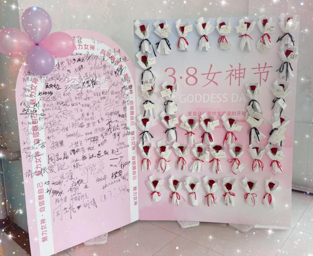 活动现场还设置了“听她说”玫瑰墙打卡点,女生们将写满自我激励话语的玫瑰卡片贴成花海,用“勇敢追光”“悦纳自我”等金句传递温暖力量。光影故事墙则通过投影播放校内女性师生代表的成长故事音频,展现女性精神品格的良好传承。