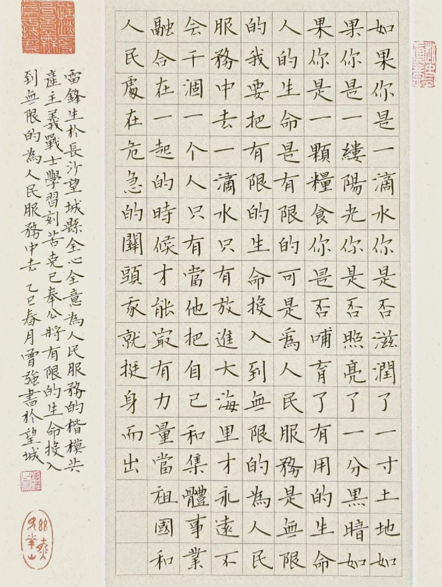 学院同步开展学雷锋主题艺术创作活动,面向学生征集美文、手抄报、海报、剪纸、书法等作品,旨在使雷锋精神化作流动的丹青长卷,在点捺转折间续写永不褪色的时代华章。本次艺术创作活动共收到投稿200余件,其中一幅硬笔书法以工整有力的字迹展现了雷锋精神的底蕴,在众多作品中脱颖而出,最终斩获一等奖。“以硬笔书法为载体,我们得以深刻体会雷锋以人民服务为宗旨的精神,也深切体会到方寸之间传递的时代温度,赋予了我们无尽的精神力量。”创作者曾强表示。