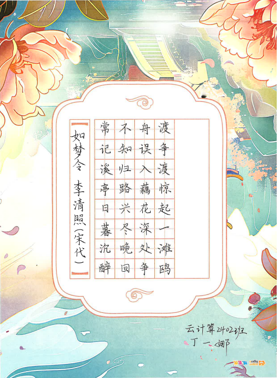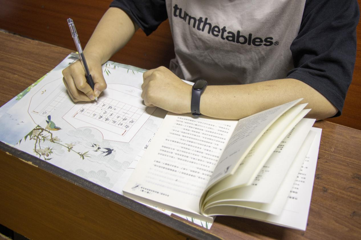 活动期间,学生们以书籍经典内容摘抄为载体,在挥毫泼墨间感悟文字魅力,以工整的字迹、灵动的笔触展现书法艺术之美。“‘争渡,争渡,惊起一滩鸥鹭’短短几句就勾勒出一幅生动有趣的画面,书写这首词的时候,我仿佛看到了李清照当时沉醉不知归路,慌乱划船的模样,特别有意思。”参加活动的学生分享道。