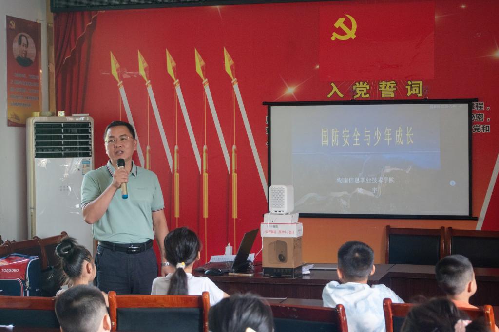 课堂上,实践团老师以通俗易懂的语言讲解国防安全的重要意义,结合诸多历史故事与现实案例,让孩子们了解国家领土、主权等基本概念。实践团老师重点讲述了粟裕将军从年少投身革命,到历经南昌起义,再到后来参与并指挥上百场重大战役,为国家独立与民族解放立下不朽功勋的故事。同时,课堂上还围绕“少年如何为国防贡献力量” 展开讨论,鼓励孩子们从爱护国旗、学习国防知识、锻炼强健体魄等身边小事做起,将个人成长与国家发展紧密联系。