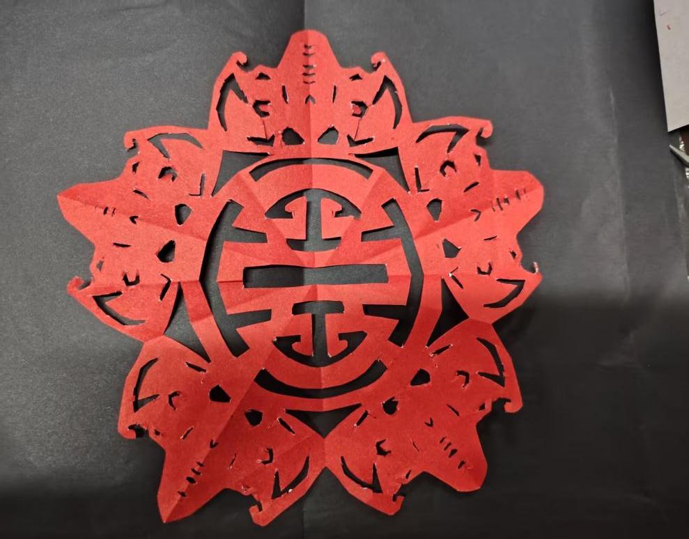 竹竿舞作为当地少数民族的传统舞蹈,以其欢快的节奏、灵动的步伐深受喜爱。“开—合—开开—合!”随着有节奏的口号声,竹竿清脆的碰撞声回荡在古村广场。实践团在不断练习下,逐渐掌握跳跃技巧,默契排成队列,随着节奏轻盈穿梭。“看似简单,实则考验全身协调和团队配合。”实践团成员刘爽感叹道。同时,实践团还探访了高椅剪纸传承人黄杏,学习高椅民俗剪纸”的独特技法,感悟剪纸艺术。