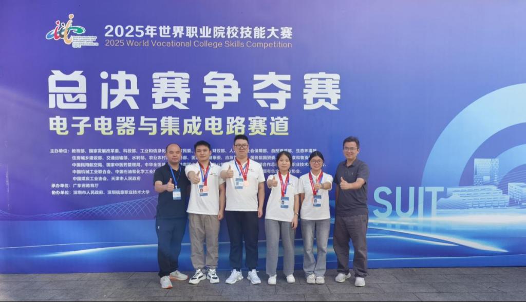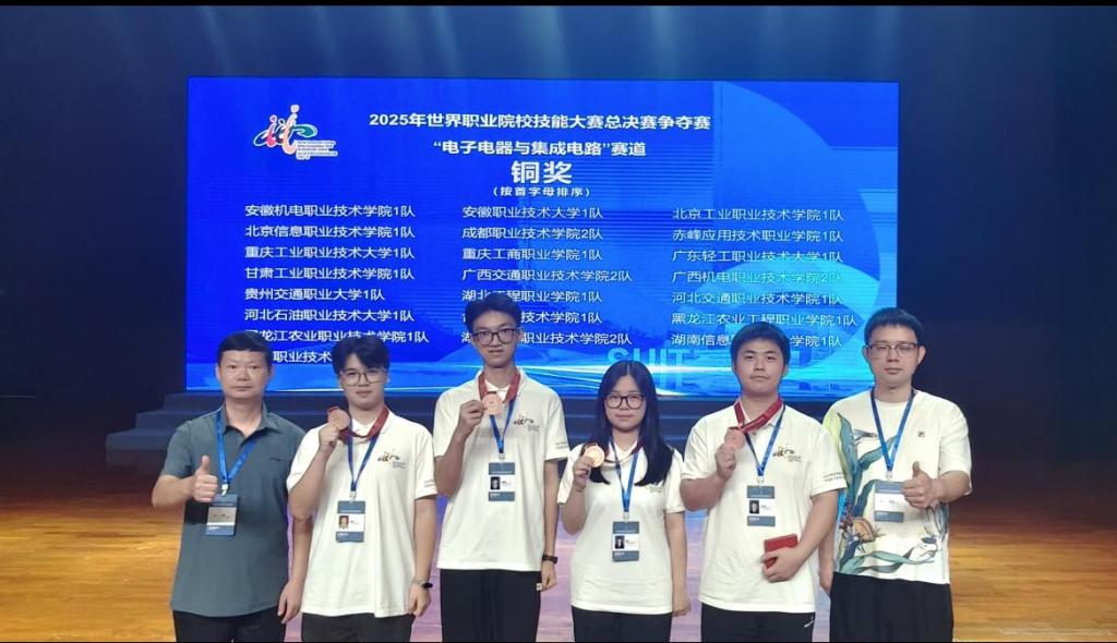 近日,2025年世界职业院校技能竞赛总决赛电子电器与集成电路赛道(高职组)在深圳信息职业技术大学顺利落幕。best365官网电子工程学院由周顺、刘俊杰、朱晶、梁意组成的物联网团队和由王佳浩、龙朝勋、傅思广、陈甜组成的嵌入式团队,凭借扎实的理论功底、娴熟的实操技能和灵活的创新思维,一路过关斩将,从全国28个赛区153支参赛队伍中脱颖而出,最终斩获2枚大赛铜牌。