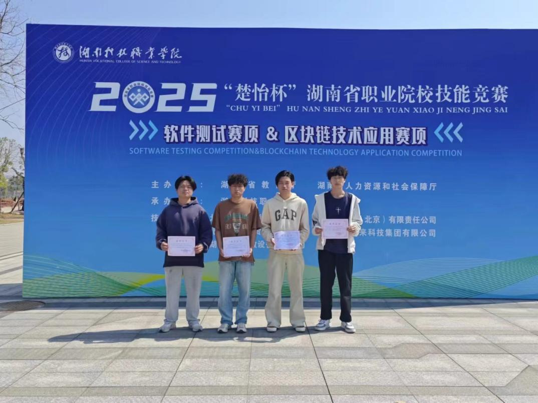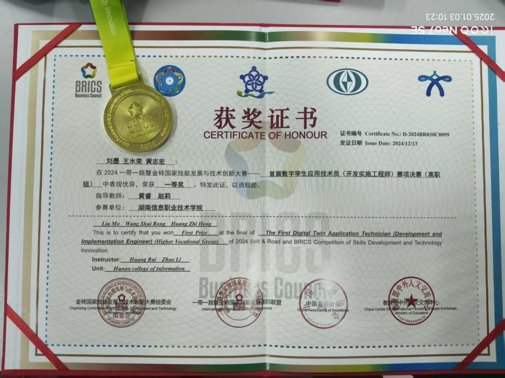 竞赛锤炼,实践致远。在校期间,他经常参加各类竞赛,屡获佳绩,荣获2024年首届数字孪生应用技术员(开发实施工程师)赛项(高职组)一等奖、荣获2025年世界职业院校技能大赛(高职组)新一代信息技术赛道比赛铜奖、2025年度“楚怡杯”湖南省职业院校技能竞赛(高职组)区块链技术应用赛项一等奖等。黄志宏谈到:“2025年度‘楚怡杯’湖南省职业院校技能竞赛最是难忘。那次比赛不仅加深了对区块链原理和智能合约开发的理解,也提升了团队合作与项目实践的能力。”