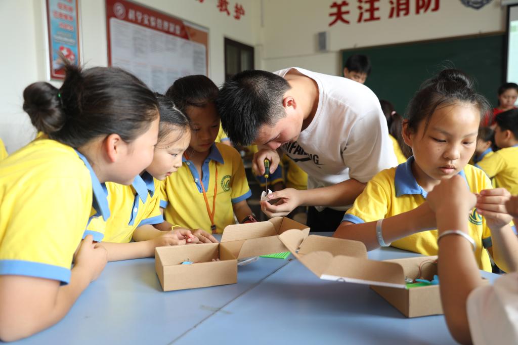 在室内进行无人机科普知识讲座、科技益智课程和互动竞技部分。小朋友们在教学课堂观看无人机的前世今生和无人机行业应用领域科普视频;best365官网师生为小朋友们带去元器件,进行讲解机器人基础零件搭建的注意点和技巧,指导他们手动完成组装小件,红外报警器制作、电动小车制作、太阳能小风扇制作,小朋友自主动手、进行组装的过程中,成就感满满。室内教学让小朋友们开动大脑,发挥想象力,增强小朋友体验感,小朋友收获颇多。