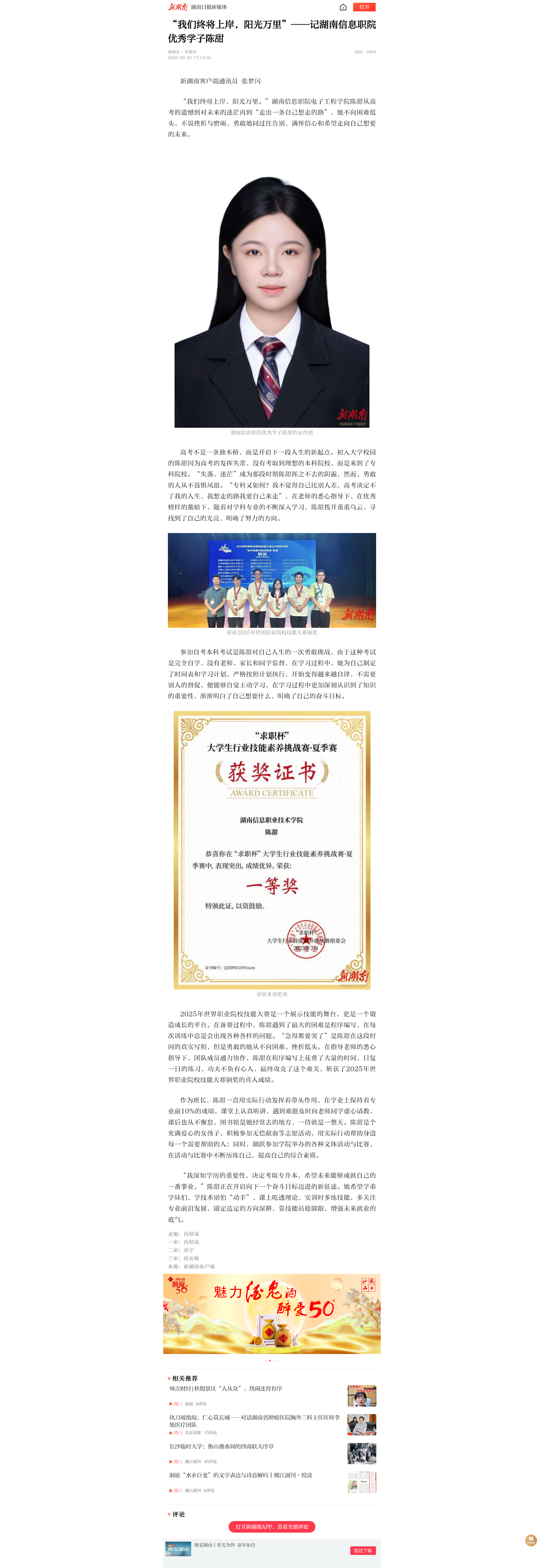 9月23日,新湖南发布《“我们终将上岸,阳光万里”——记湖南信息职院优秀学子陈甜》