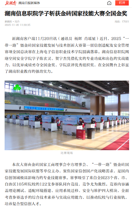 11月20日,新湖南发布《湖南信息职院学子斩获金砖国家技能大赛全国金奖》