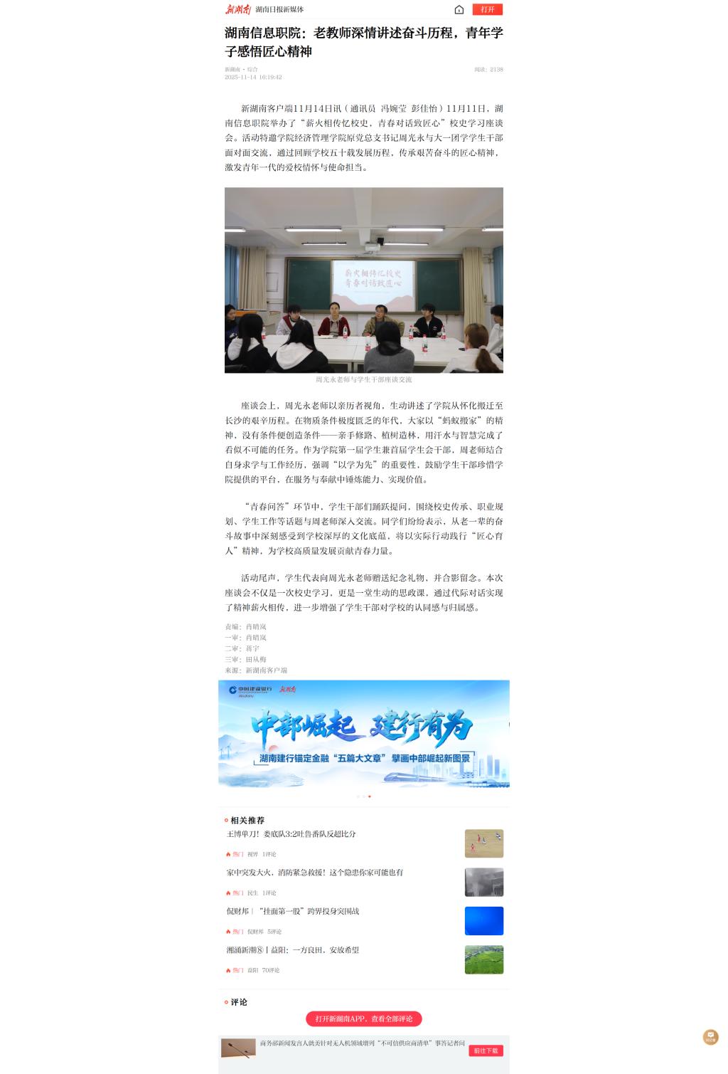 11月14日,新湖南发布《湖南信息职院:老教师深情讲述奋斗历程,青年学子感悟匠心精神》