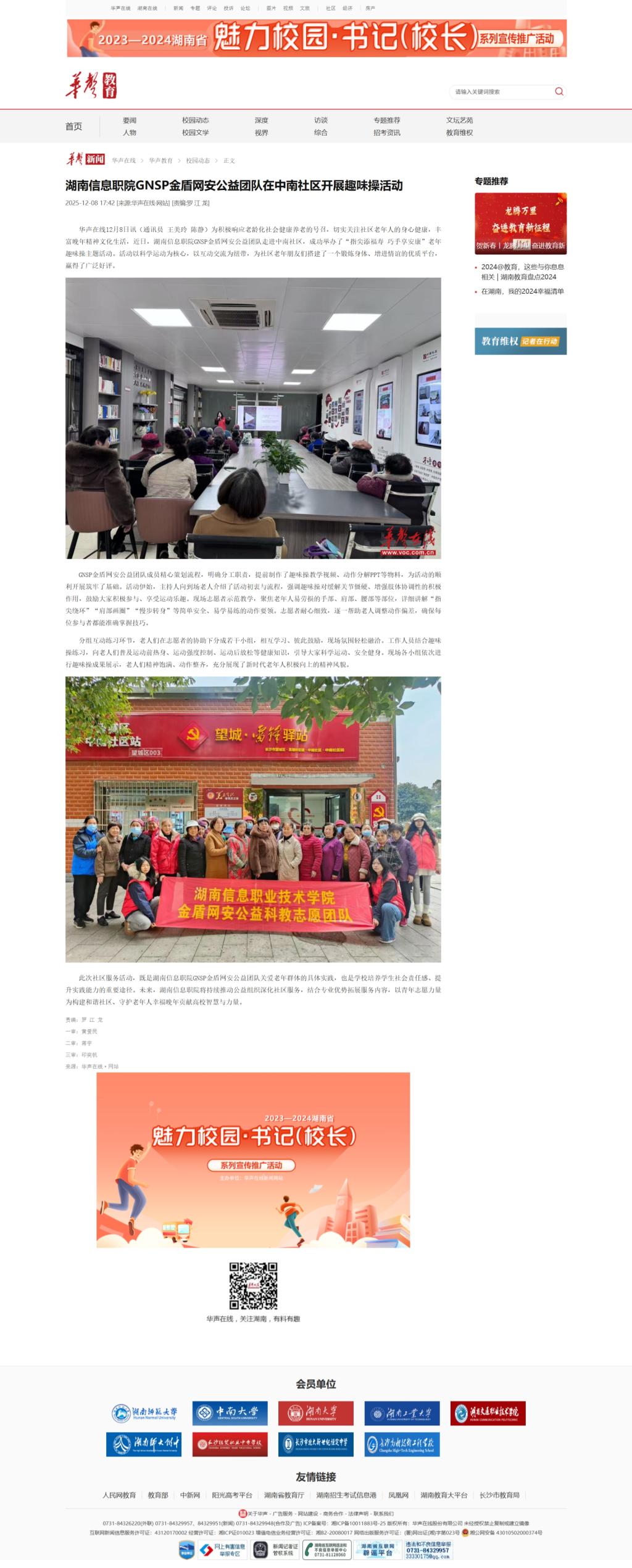 12月8日,华声在线发布《湖南信息职院GNSP金盾网安公益团队在中南社区开展趣味操活动》