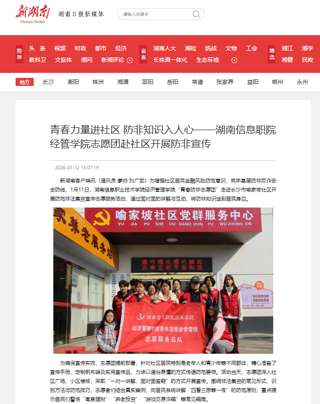 1月12日新湖南发布《青春力量进社区 防非知识入人心——湖南信息职院志愿团进入社区开展防非宣传》
