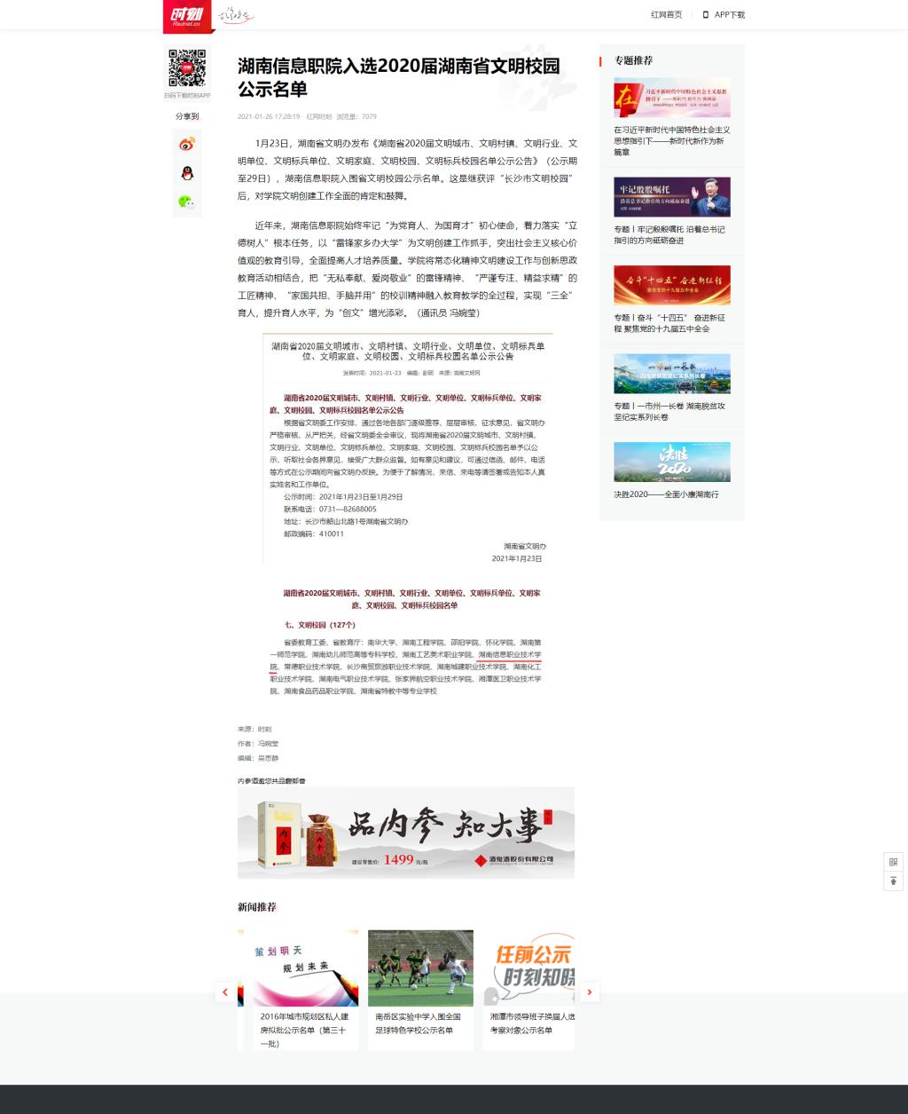 1月26日,红网发布《湖南信息职院入选2020届湖南省文明校园公示名单》。
