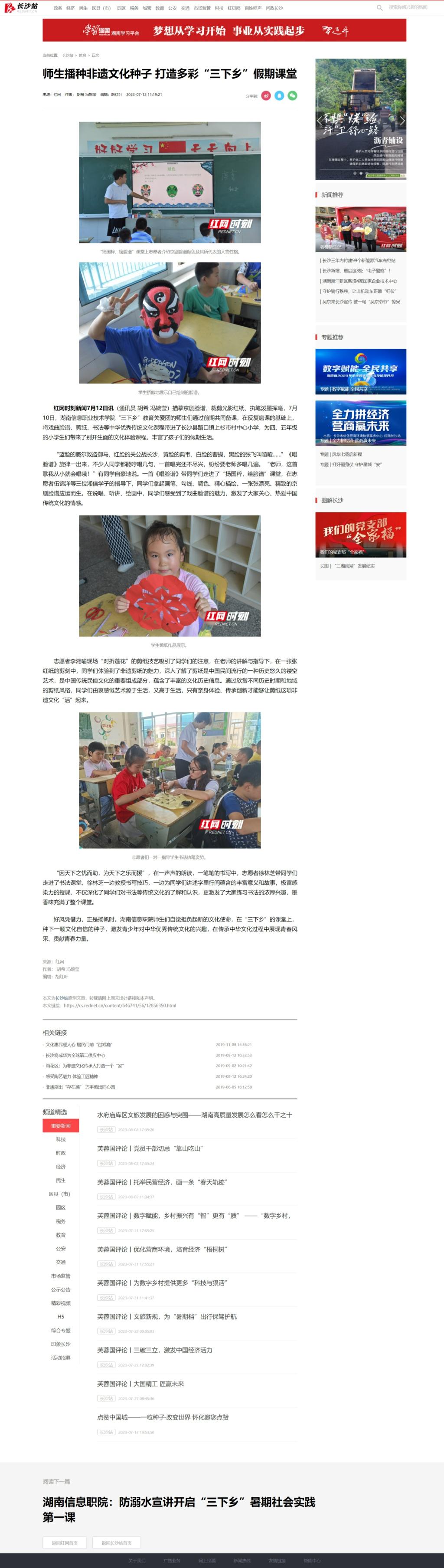 7月12日,红网发布《师生播种非遗文化种子 打造多彩“三下乡”假期课堂》