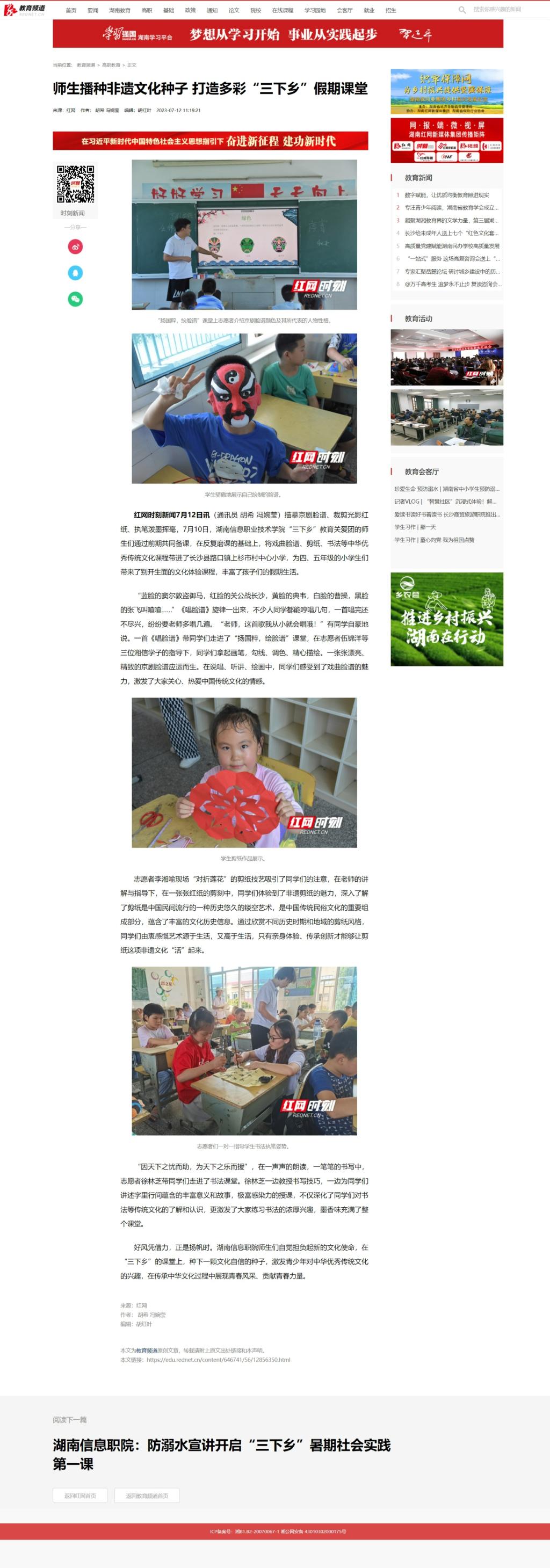 7月12日,红网发布《师生播种非遗文化种子 打造多彩“三下乡”假期课堂》