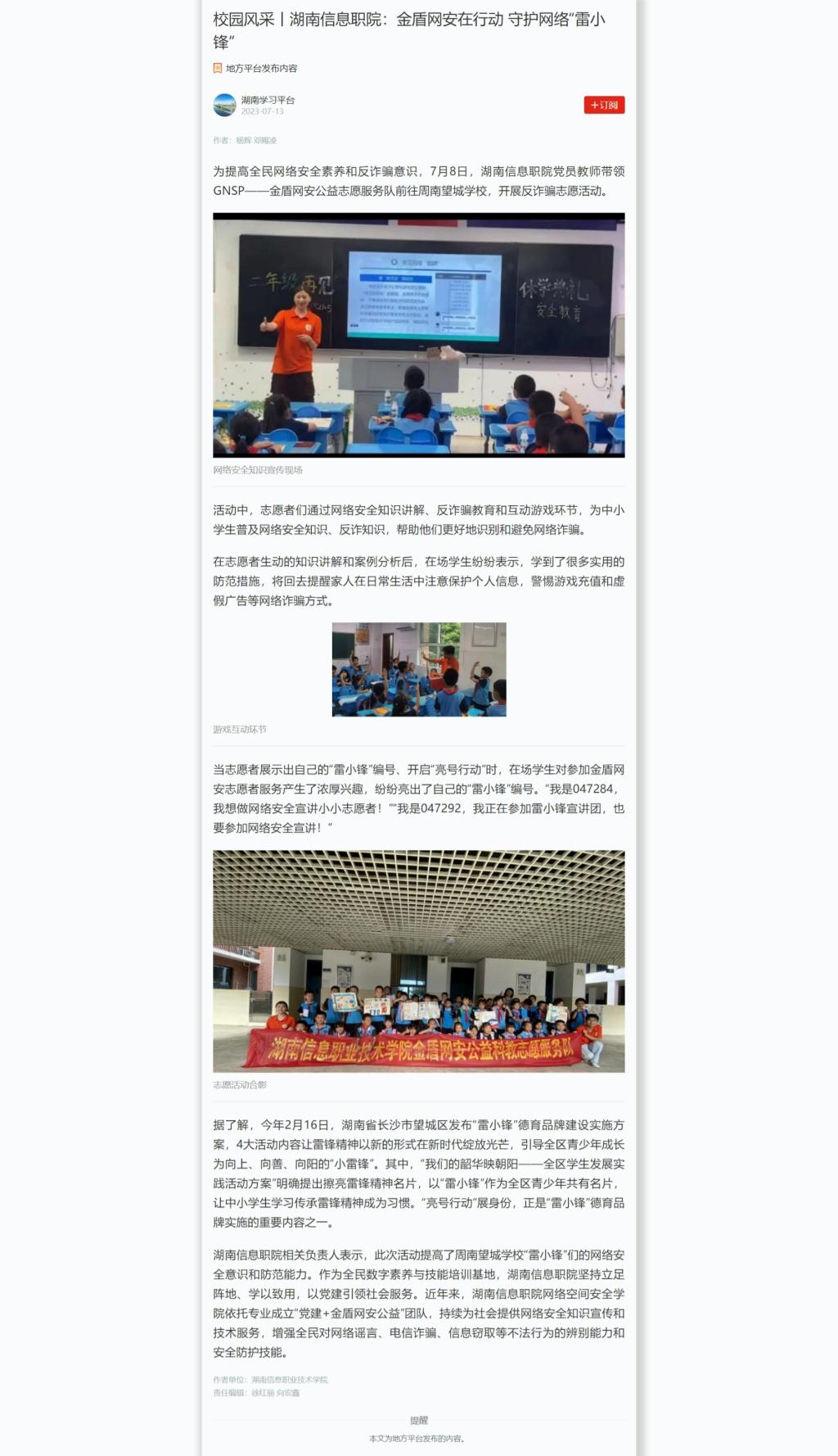 7月13日,学习强国发布《校园风采丨湖南信息职院:金盾网安在行动 守护网络“雷小锋”》