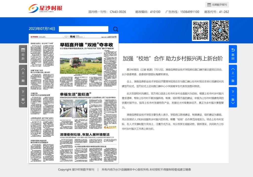 7月14日,星沙时报发布《加强“校地”合作 助力乡村振兴再上新台阶》