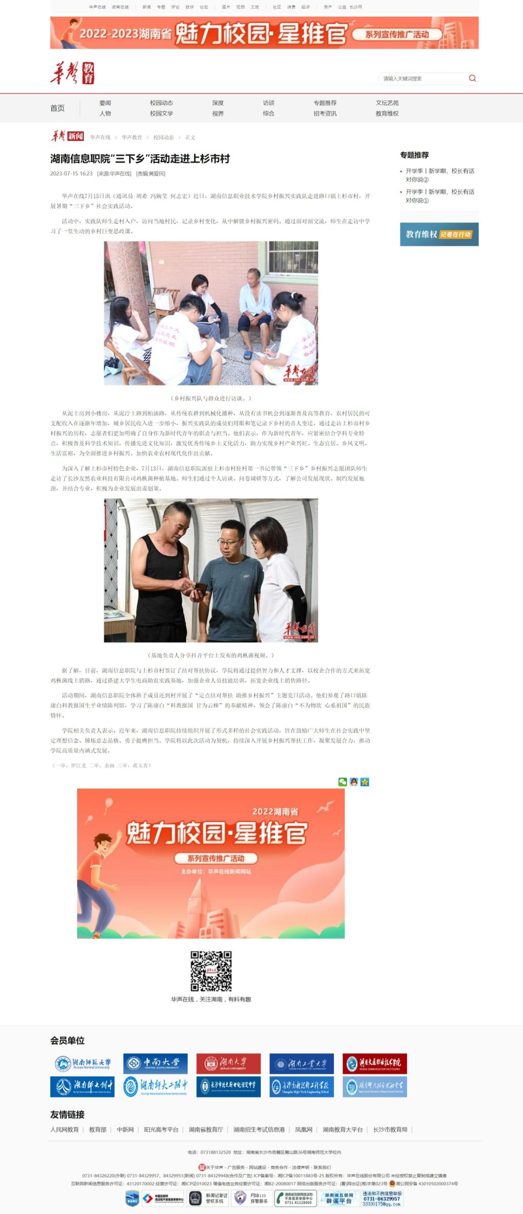 7月25日,华声在线发布《湖南信息职院“三下乡”活动走进上杉市村》