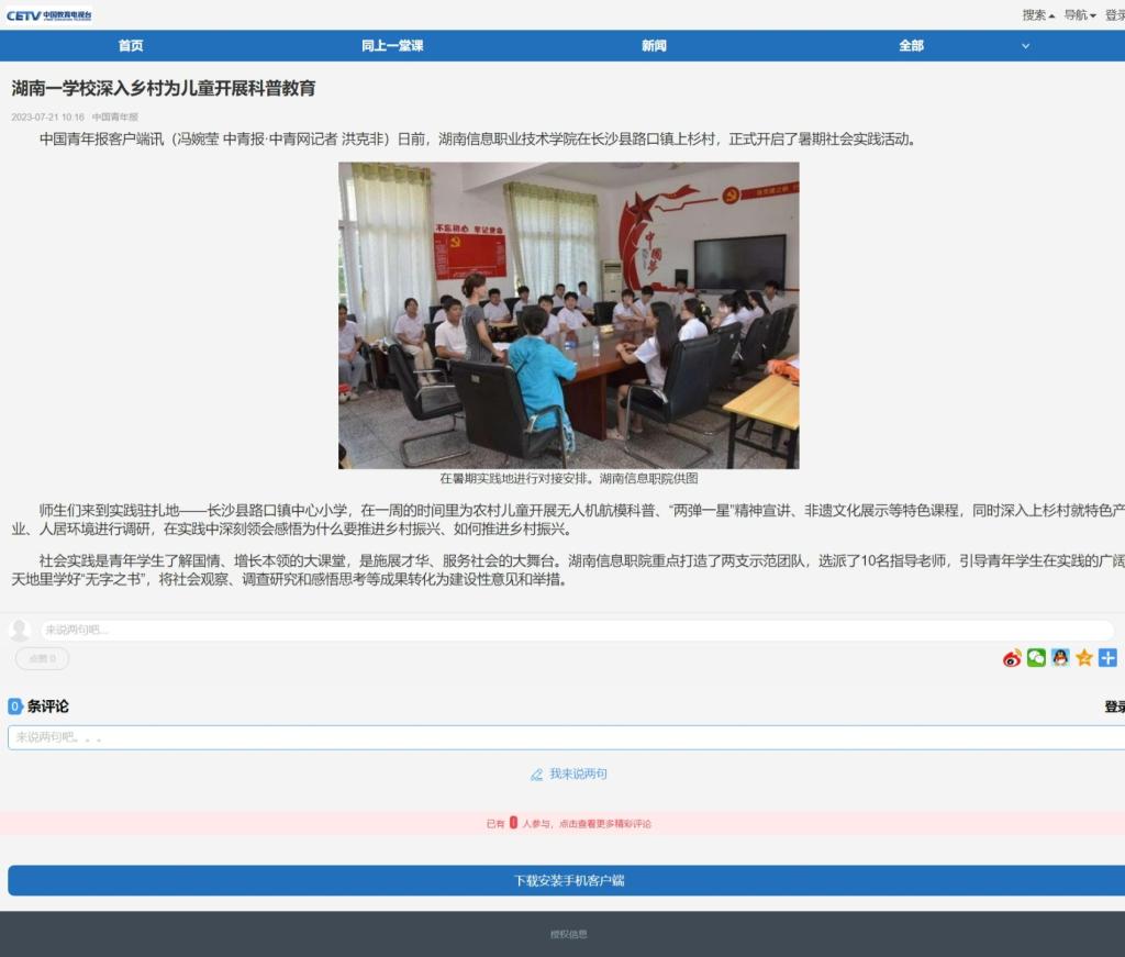 7月21日,CETV中国教育电视台客户端发布《湖南一学校深入乡村为儿童开展科普教育》