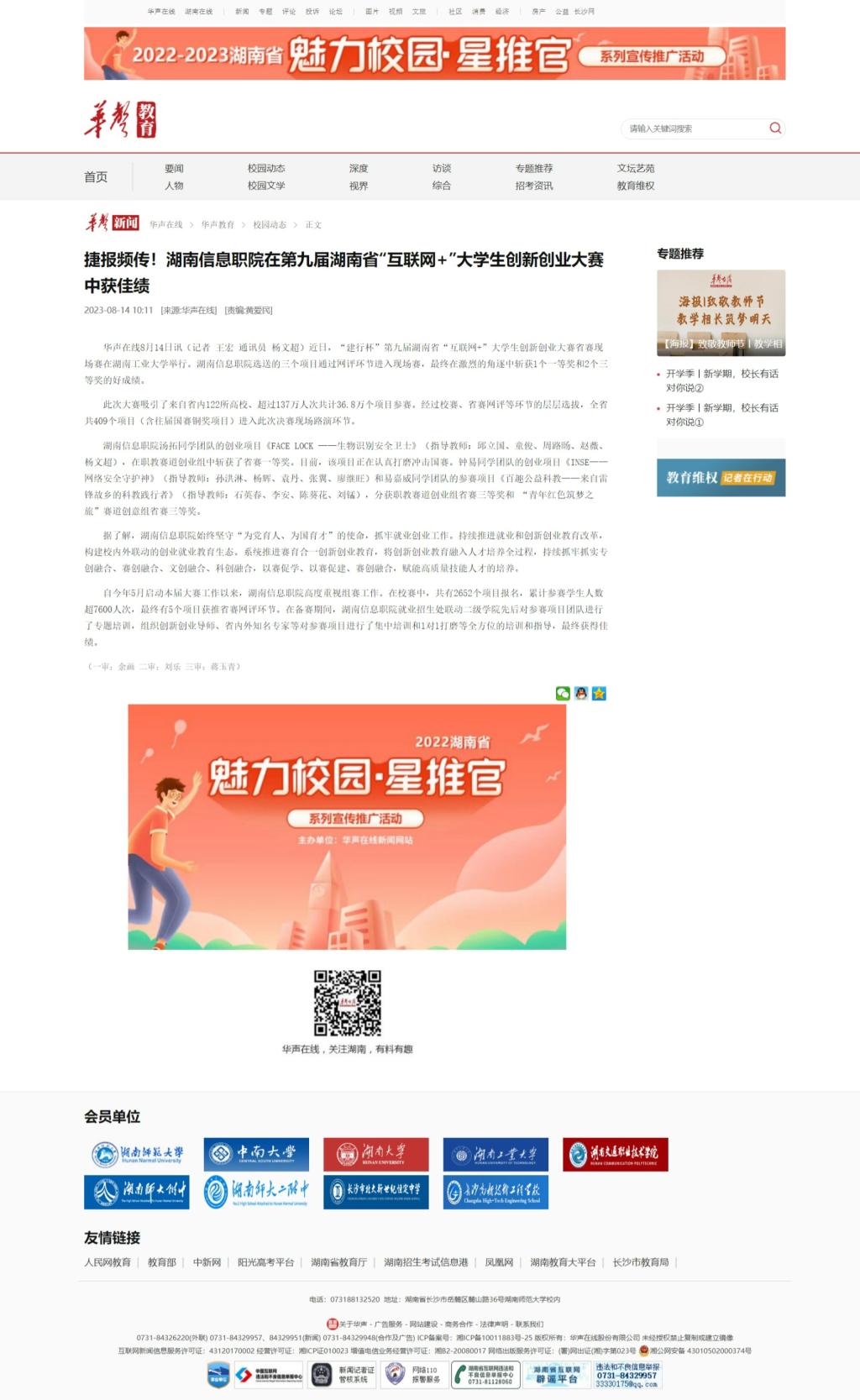 8月14日,华声在线发布《捷报频传!湖南信息职院在第九届湖南省“互联网+”大学生创新创业大赛中获佳绩》