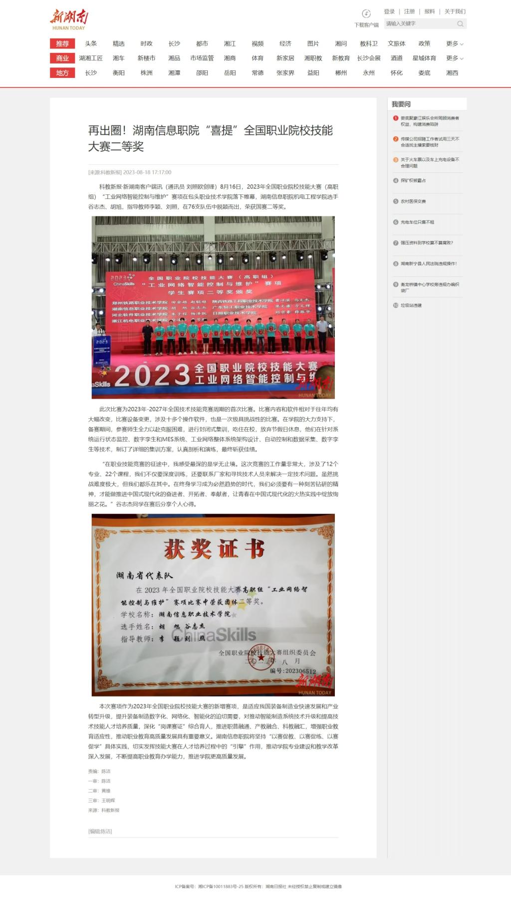 8月18日,新湖南客户端发布《再出圈!湖南信息职院“喜提”全国职业院校技能大赛二等奖》