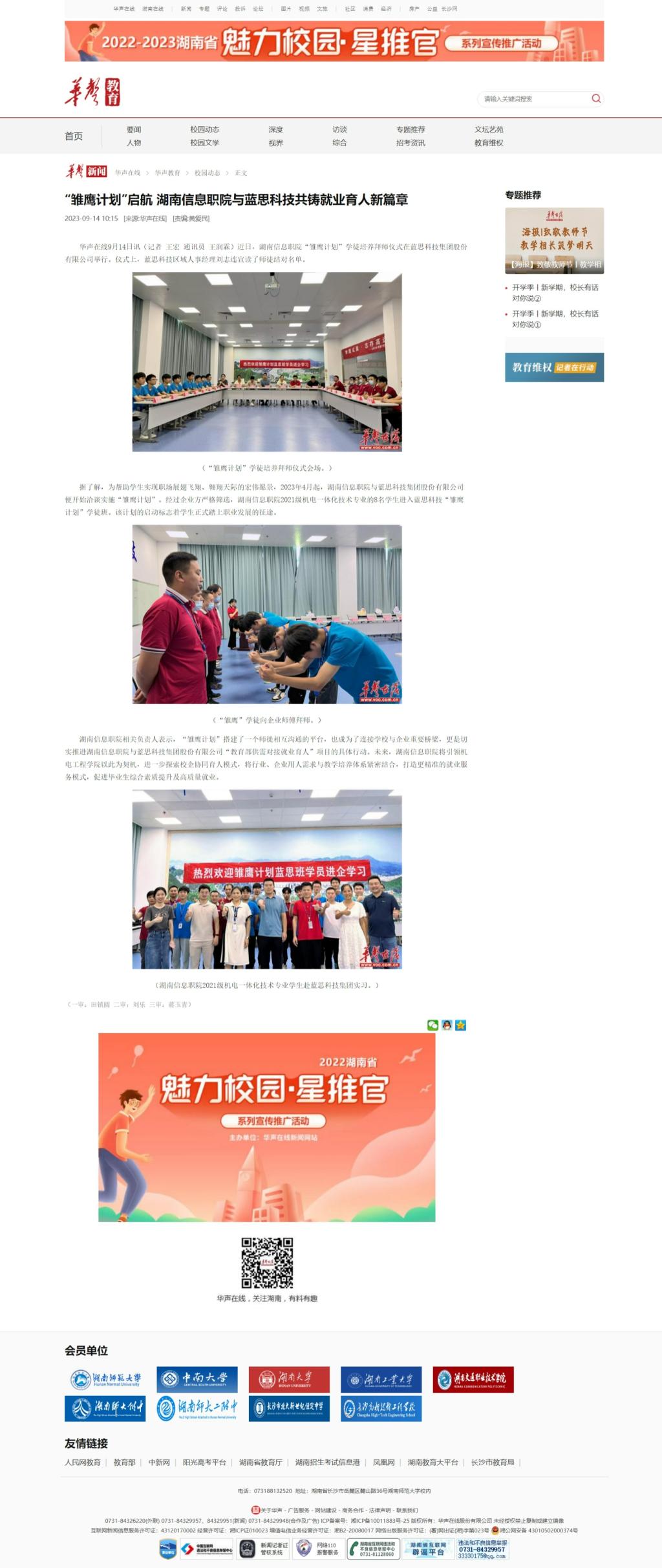9月14日,华声在线发布《“雏鹰计划”启航 湖南信息职院与蓝思科技共铸就业育人新篇章》