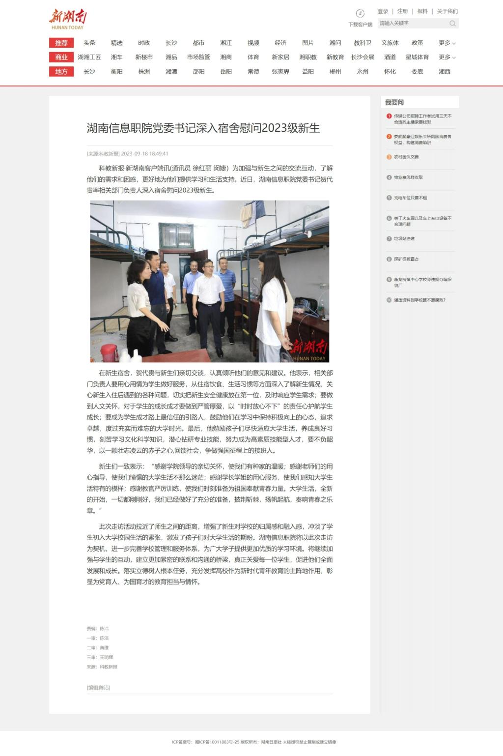 9月18日,新湖南发布《湖南信息职院党委书记深入宿舍慰问2023级新生》