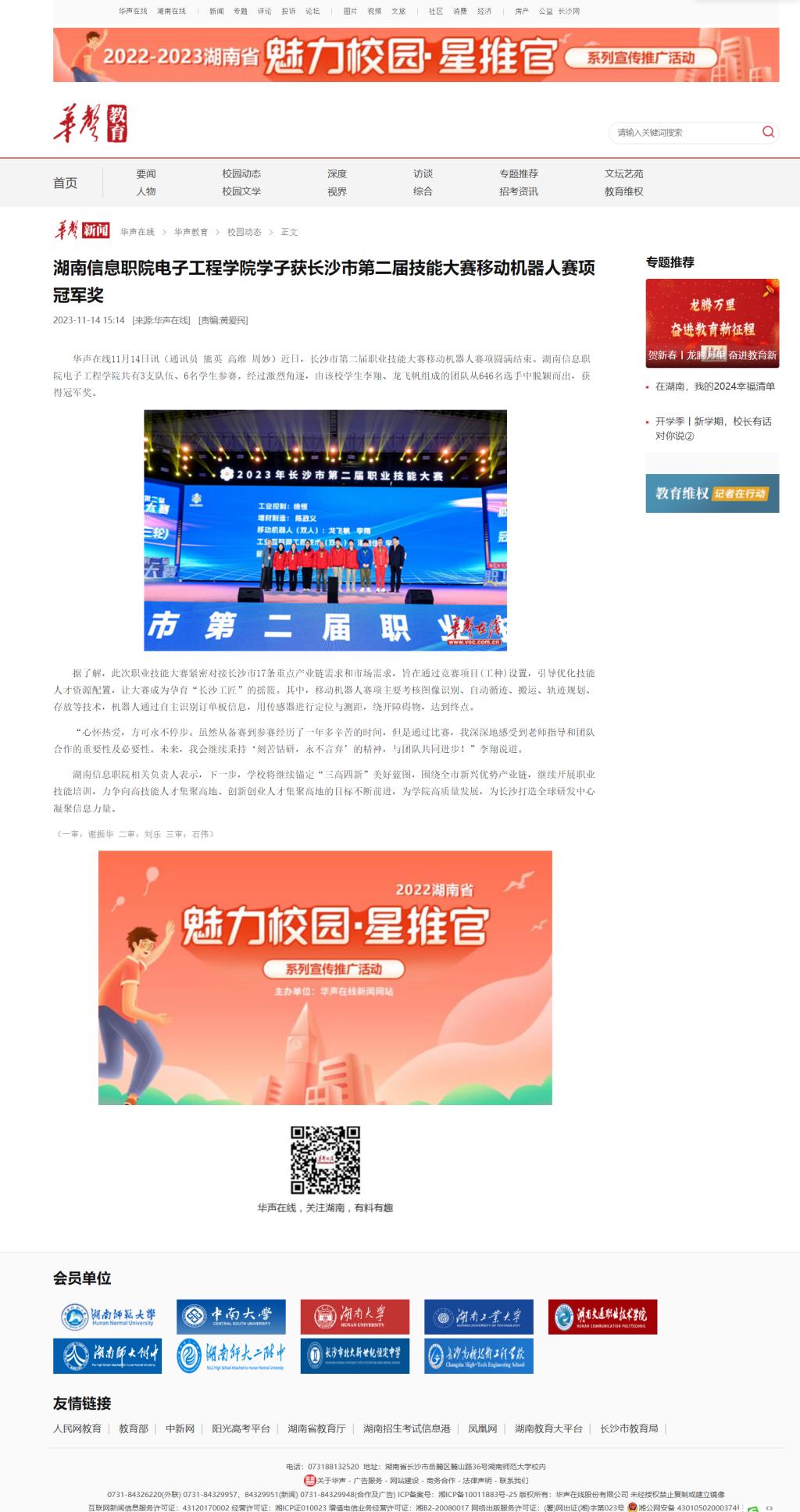 11月14日,华声在线发布《湖南信息职院电子工程学院学子获长沙市第二届技能大赛移动机器人赛项冠军奖》