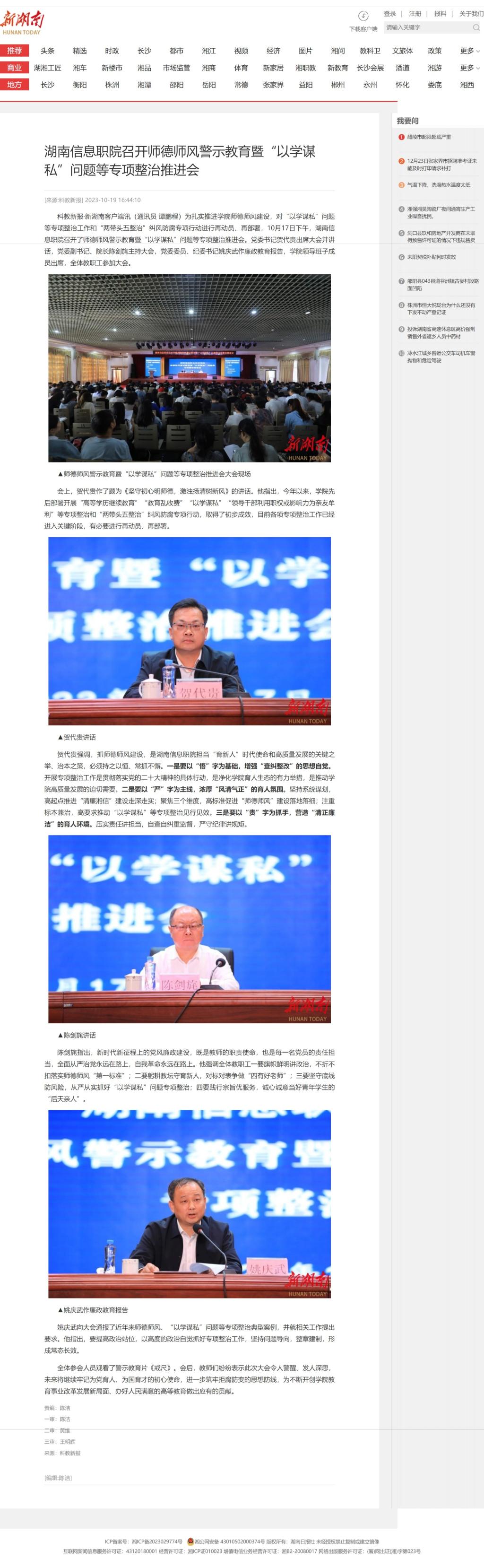 10月19日,新湖南发布《湖南信息职院召开师德师风警示教育暨“以学谋私”问题等专项整治推进会》