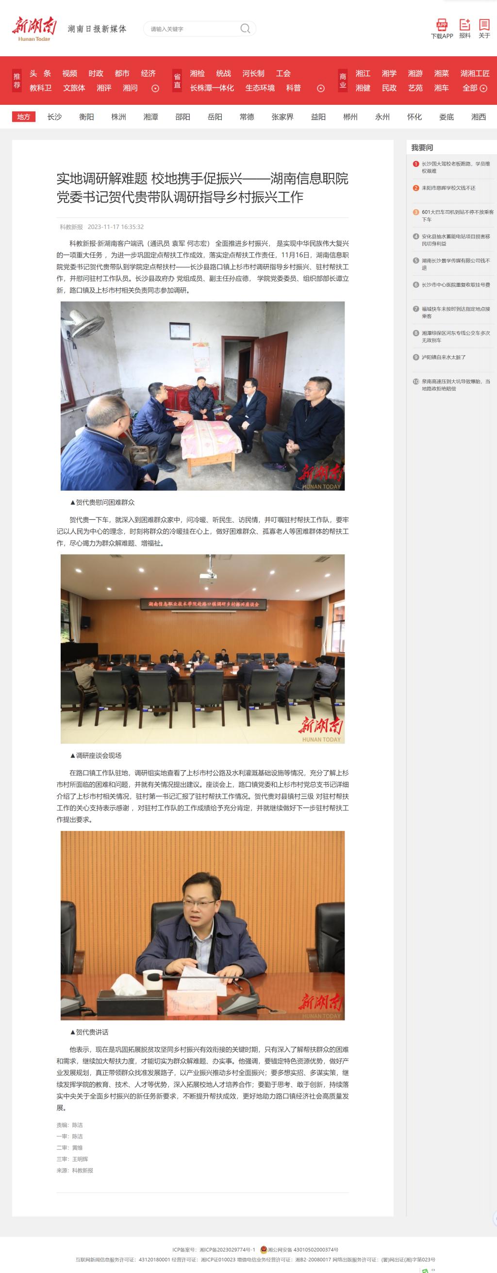 11月17日,新湖南发布《实地调研解难题 校地携手促振兴——湖南信息职院党委书记贺代贵带队调研指导乡村振兴工作》