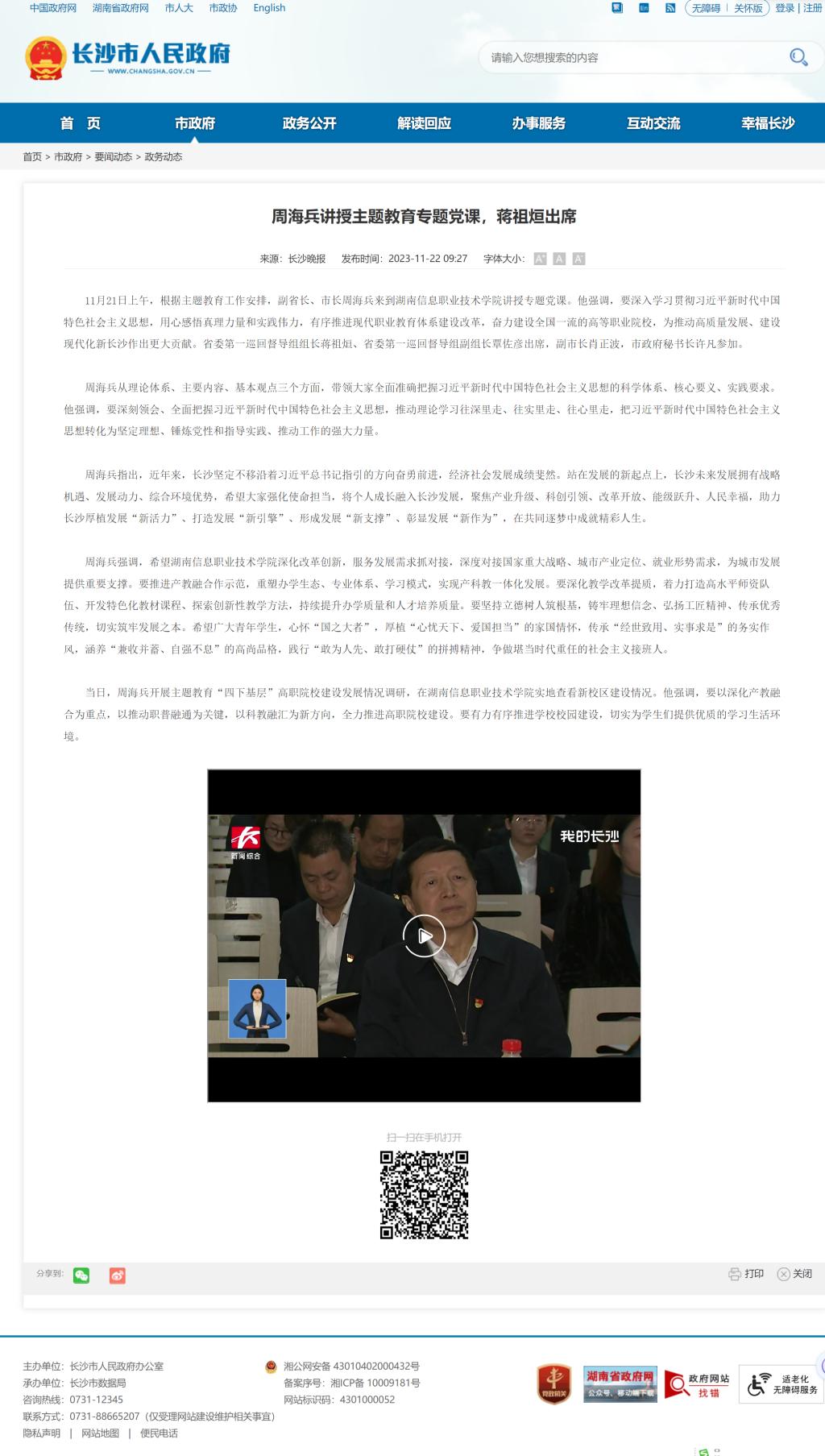 11月22日,长沙市人民政府发布《周海兵讲授主题教育专题党课,蒋祖烜出席》