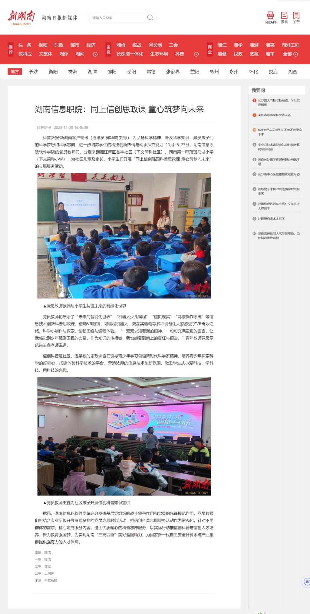 11月29日,新湖南发布《湖南信息职院:同上信创思政课 童心筑梦向未来》