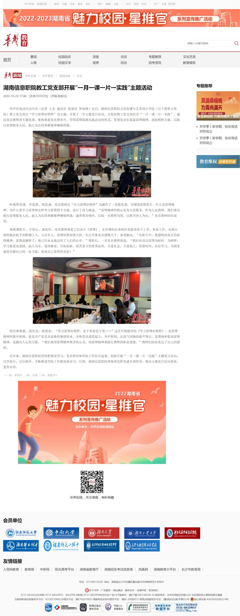 10月23日,华声在线发布《湖南信息职院教工党支部开展“一月一课一片一实践”主题活动》