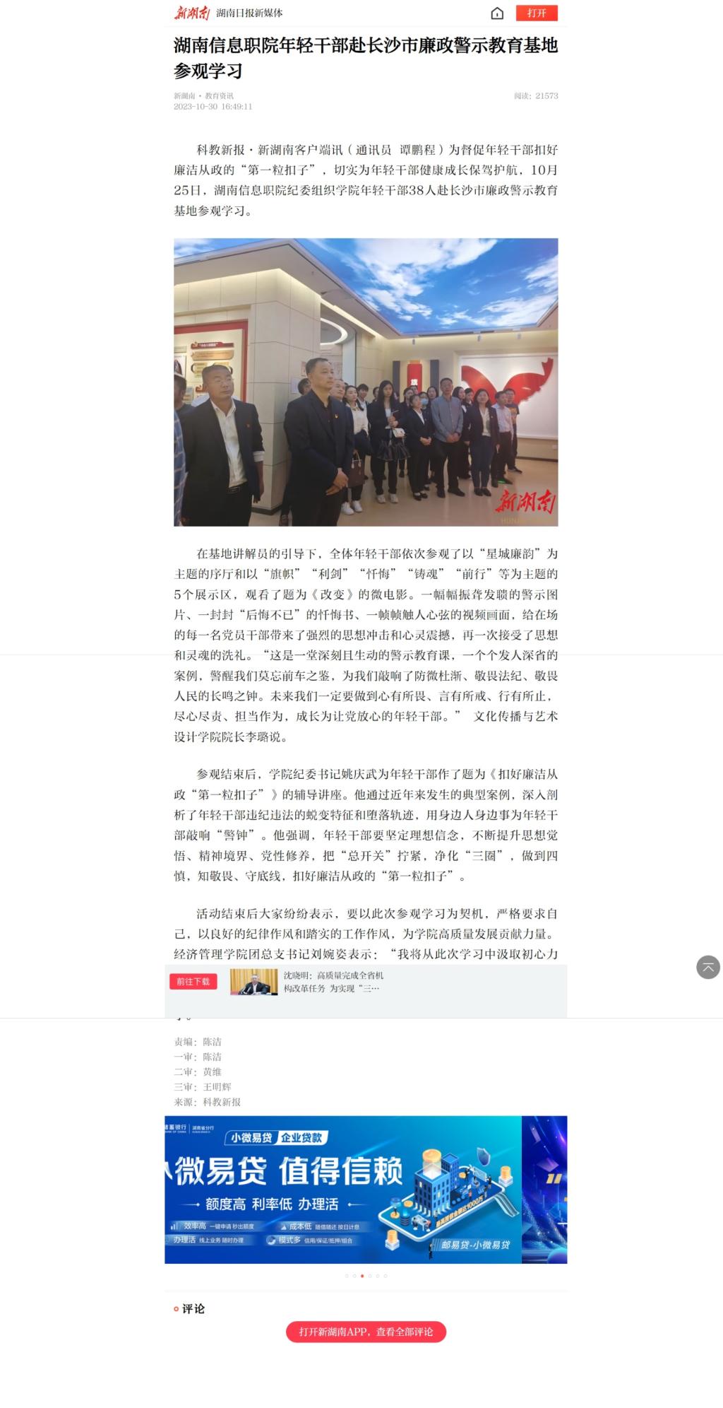 10月30日,新湖南客户端发布《湖南信息职院年轻干部赴长沙市廉政警示教育基地参观学习》