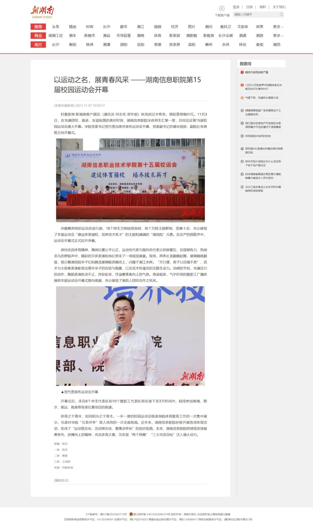 11月7日,新湖南发布《以运动之名,展青春风采 ——湖南信息职院第15届校园运动会开幕》