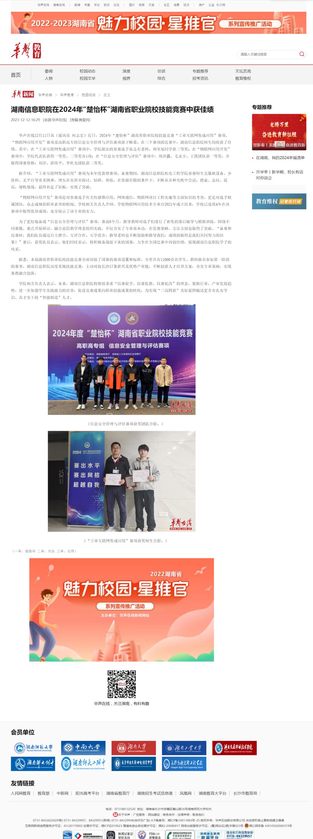 12月12日,华声在线发布《湖南信息职院在2024年“楚怡杯”湖南省职业院校技能竞赛中获佳绩》