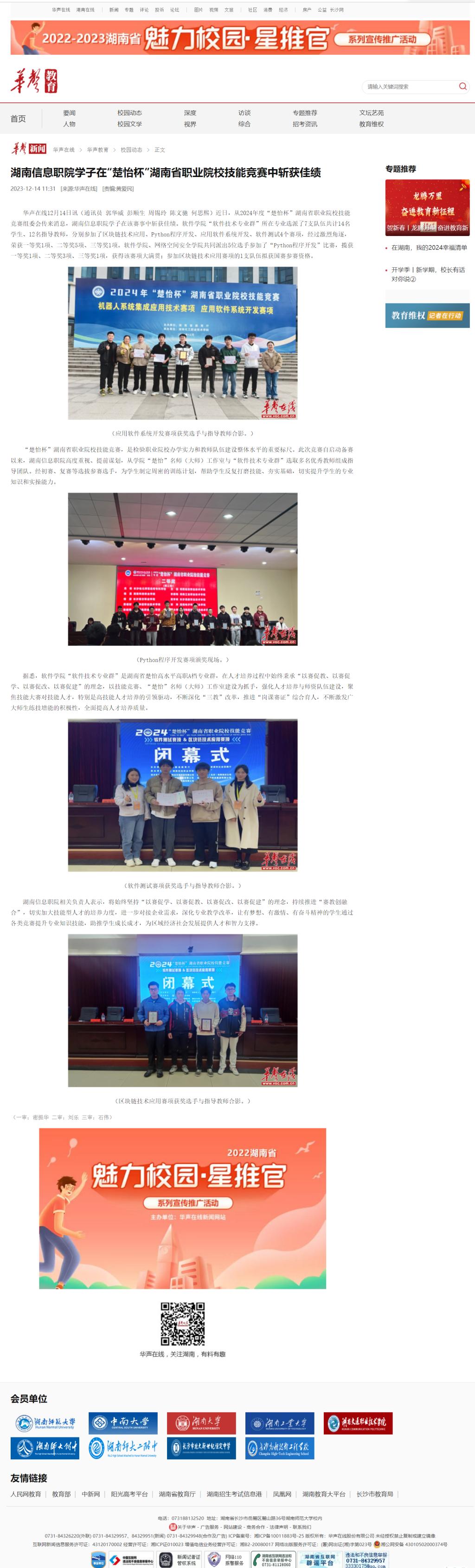 12月14日,华声在线发布《湖南信息职院学子在“楚怡杯”湖南省职业院校技能竞赛中斩获佳绩》