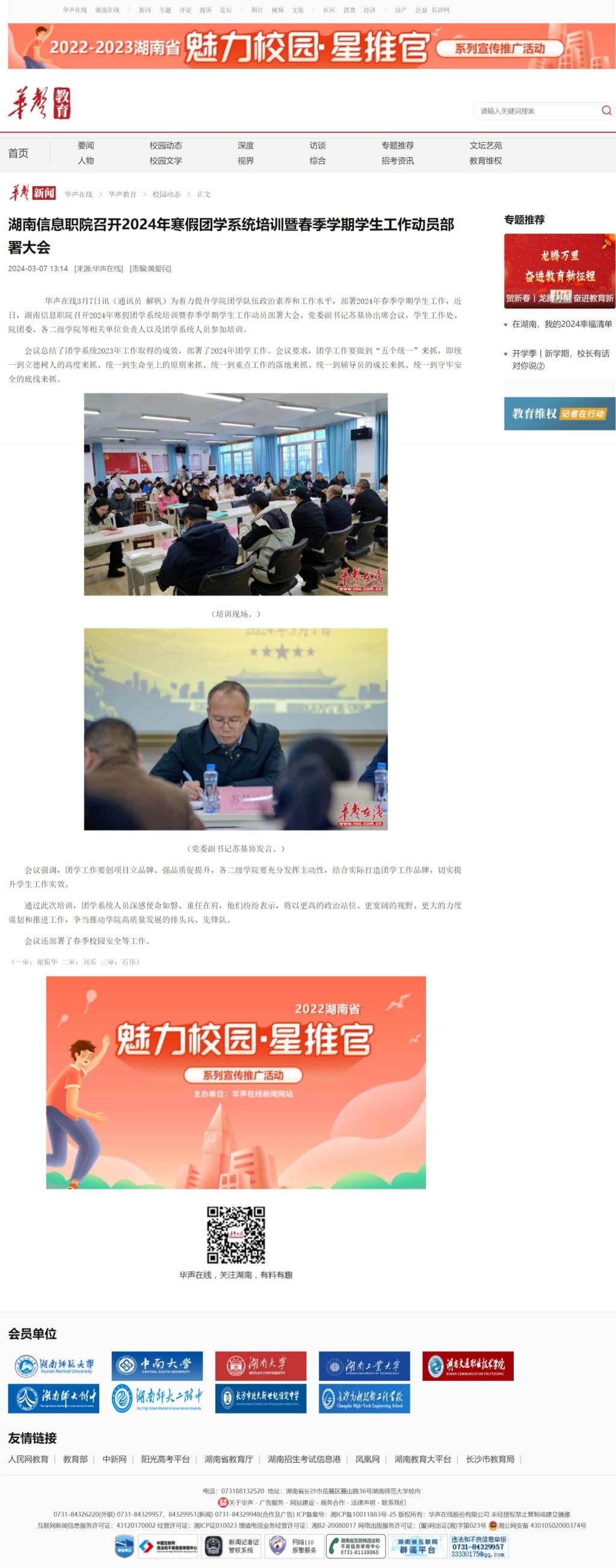 3月7日,华声在线发布《湖南信息职院召开2024年寒假团学系统培训暨春季学期学生工作动员部署大会》