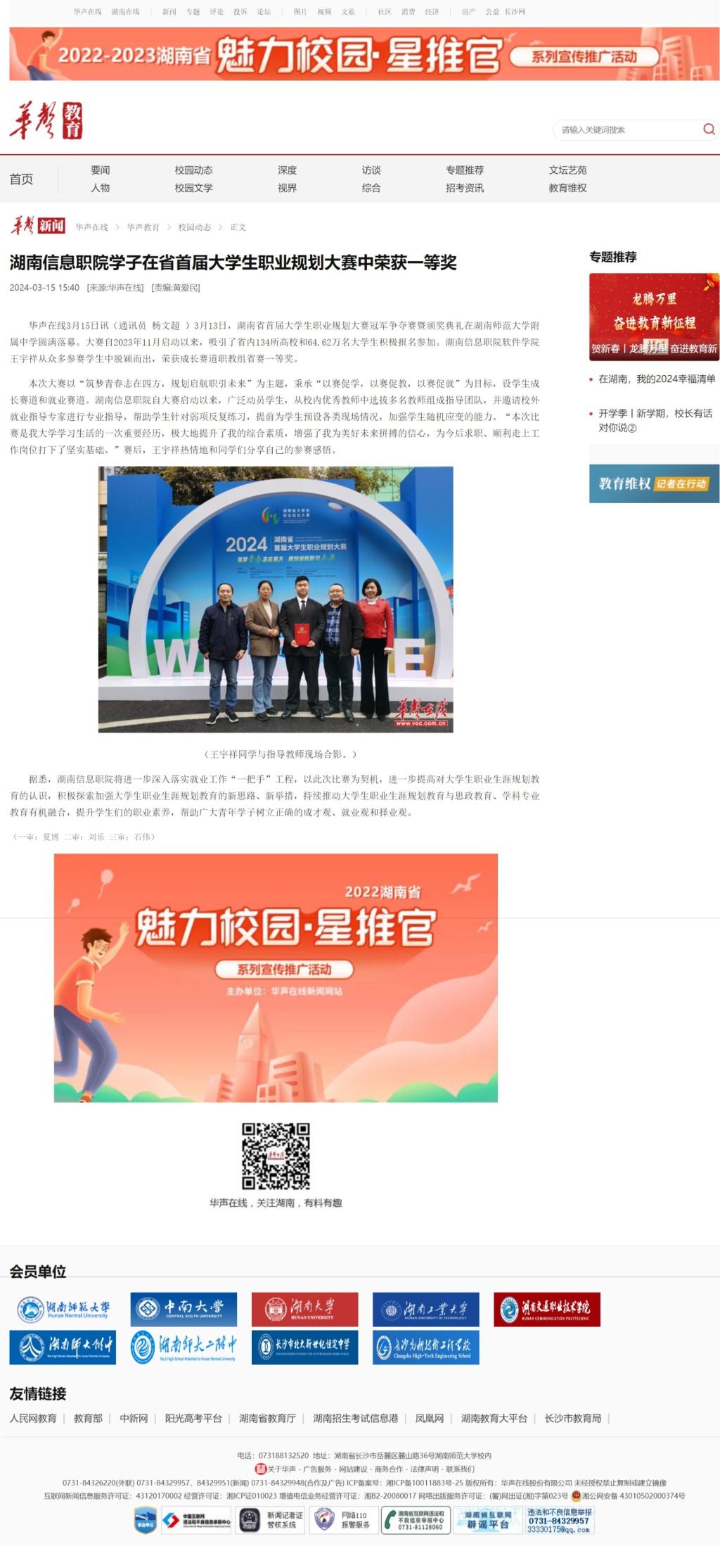 3月15日,华声在线发布《湖南信息职院学子在省首届大学生职业规划大赛中荣获一等奖》