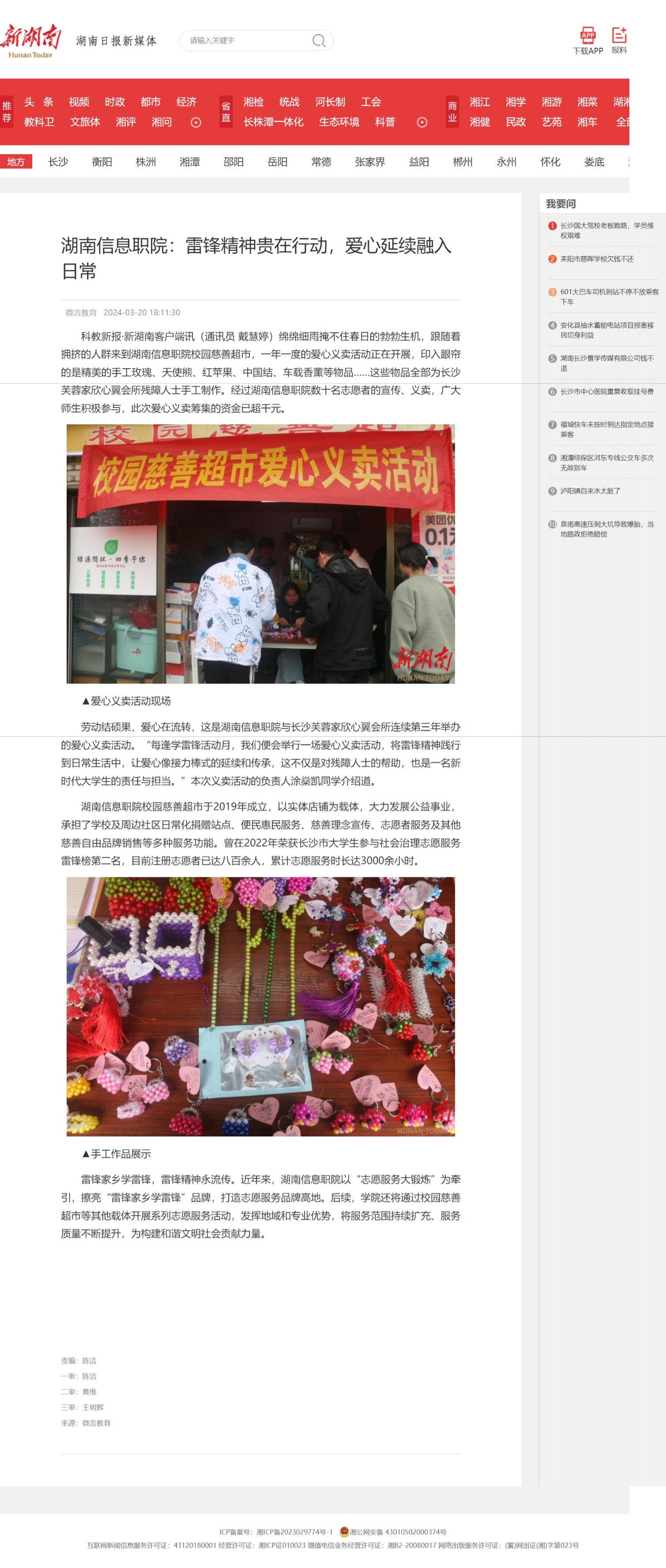 3月20日,新湖南发布《湖南信息职院:雷锋精神贵在行动,爱心延续融入日常》
