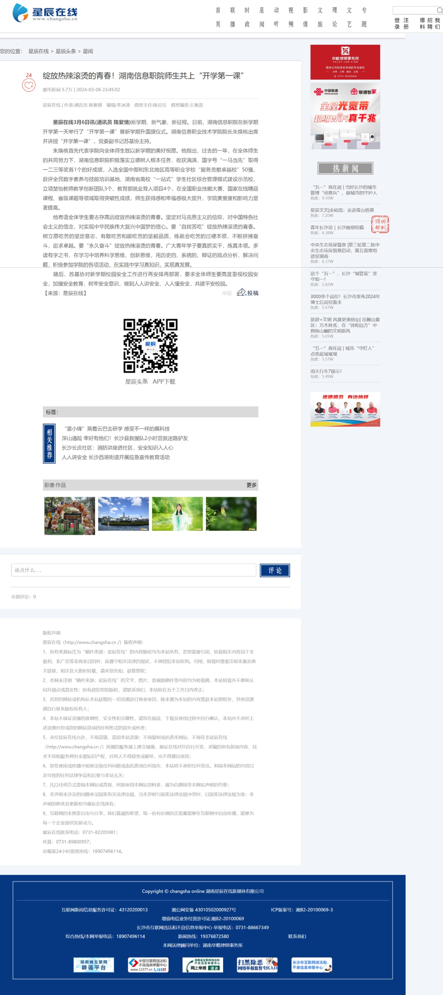 3月6日,星辰在线发布《绽放热辣滚烫的青春!湖南信息职院师生共上“开学第一课”》