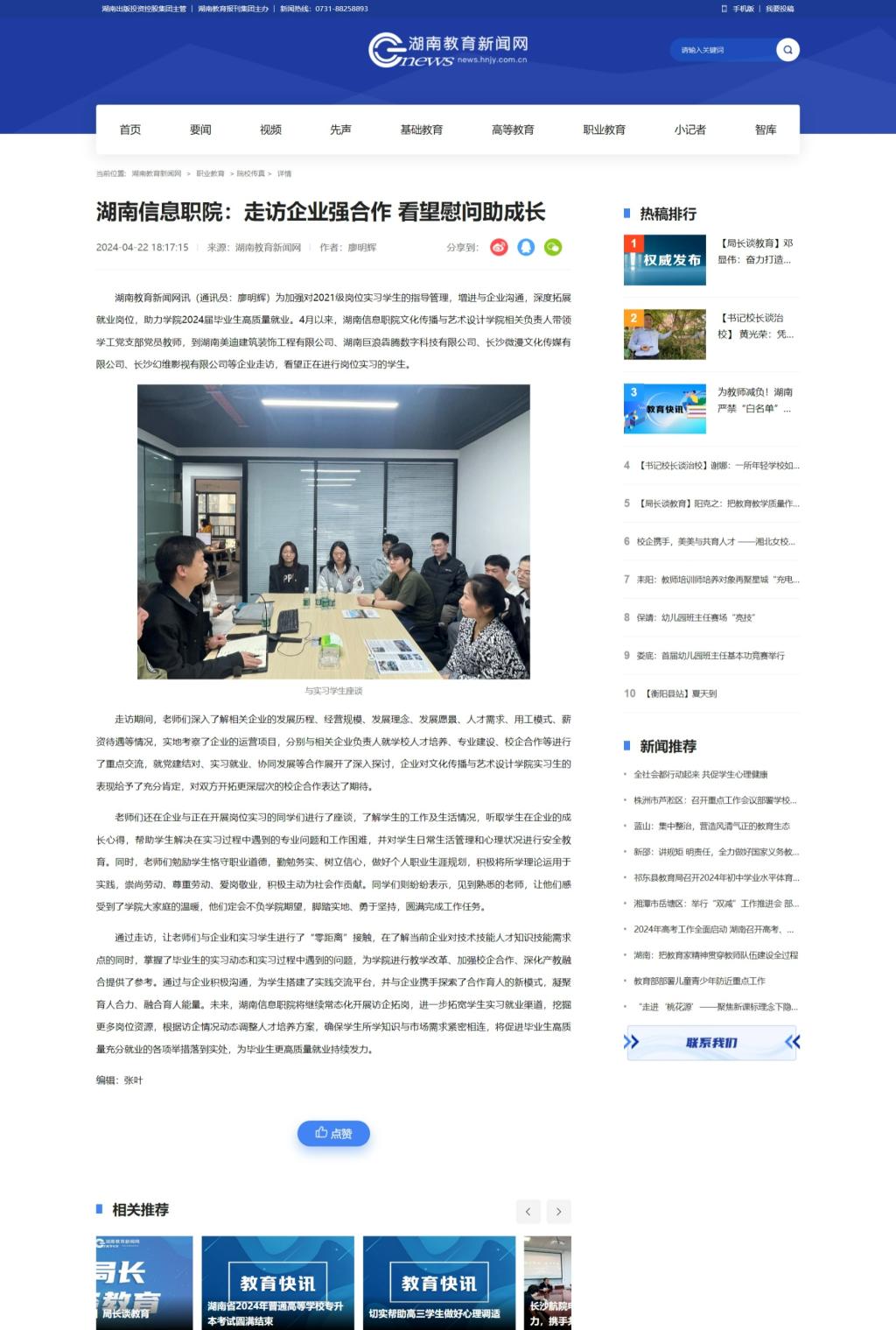 4月22日,湖南教育新闻网发布《湖南信息职院:走访企业强合作 看望慰问助成长》