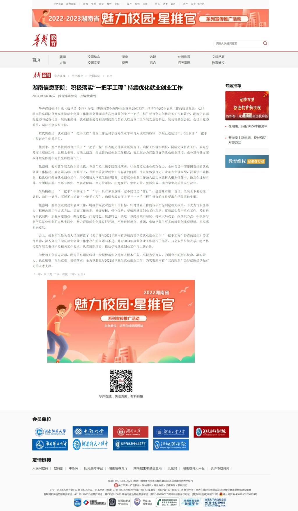 4月8日,华声在线发布《湖南信息职院:积极落实“一把手工程” 持续优化就业创业工作》