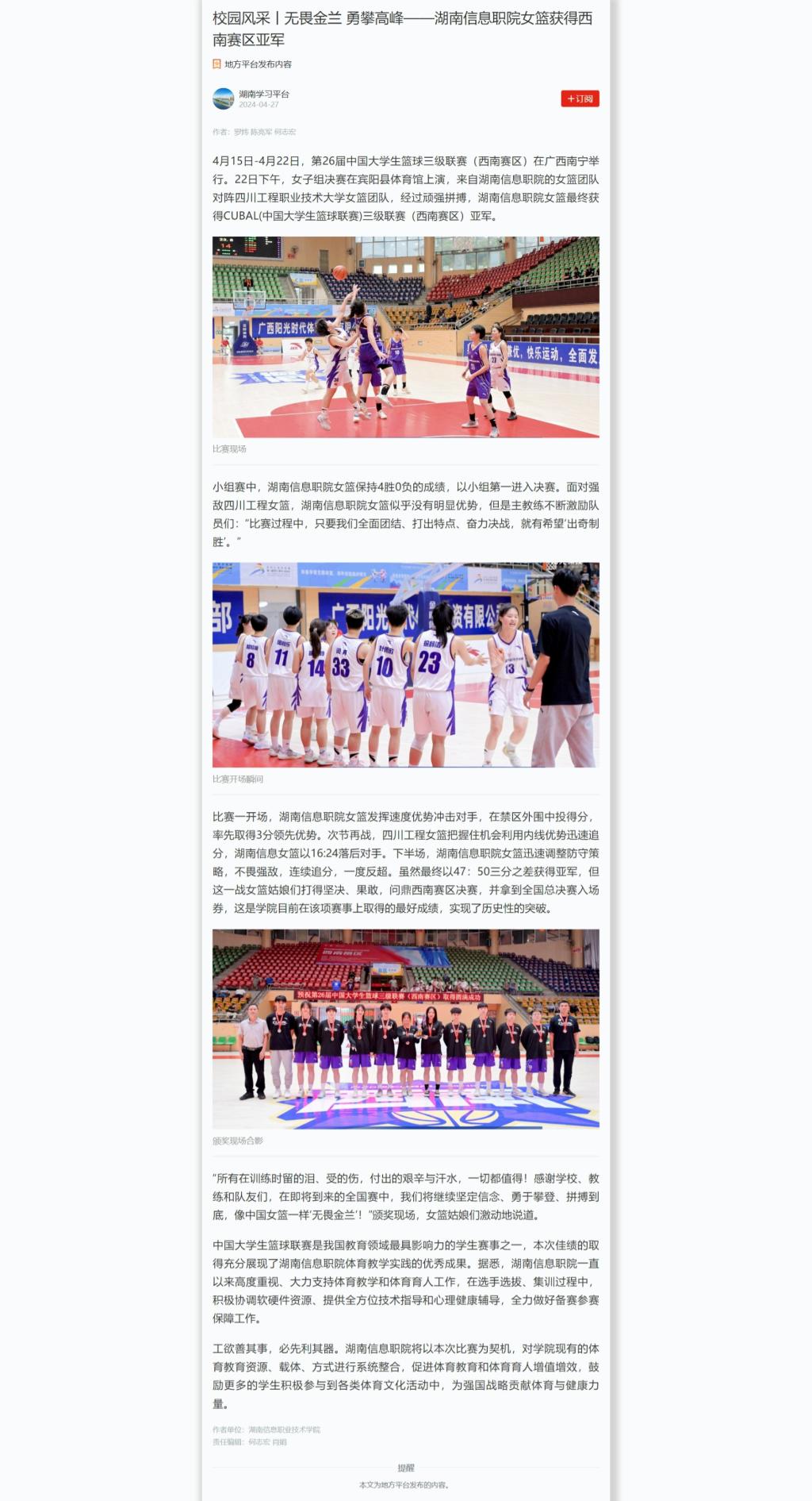 4月27日,学习强国发布《校园风采丨无畏金兰 勇攀高峰——湖南信息职院女篮获得西南赛区亚军》