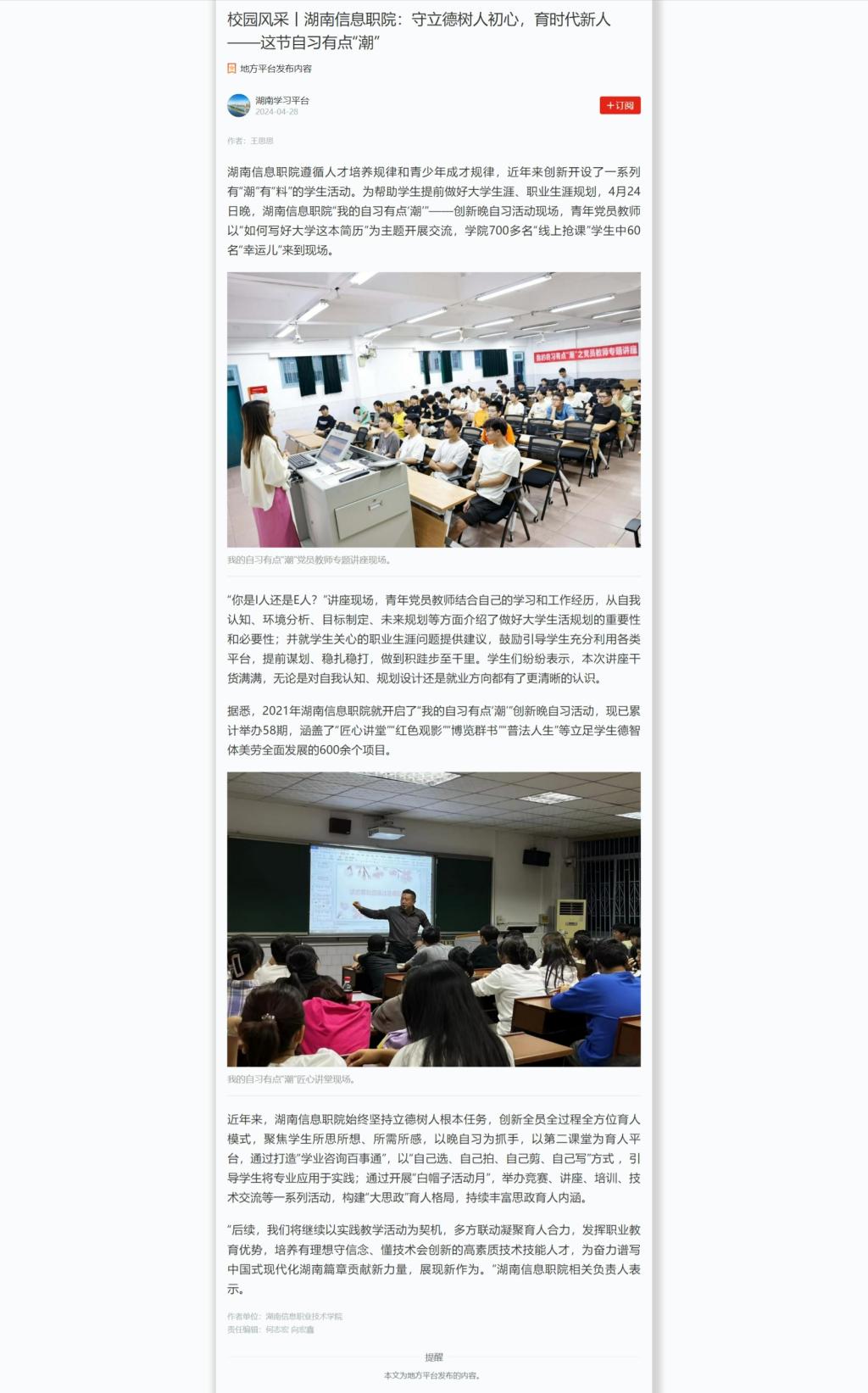 4月28日,学习强国发布《校园风采丨湖南信息职院:守立德树人初心,育时代新人——这节自习有点“潮”》
