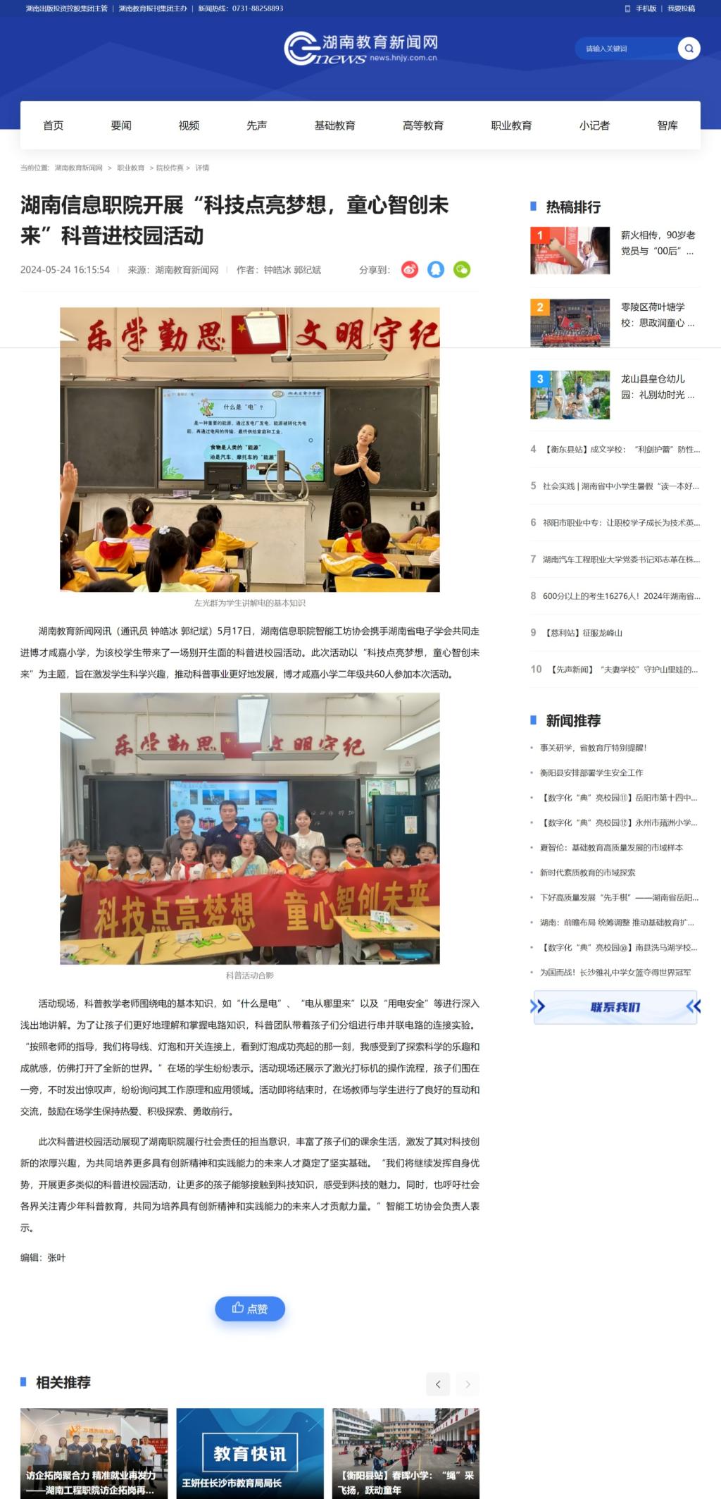 5月24日,湖南教育新闻网发布《湖南信息职院开展“科技点亮梦想,童心智创未来”科普进校园活动》。