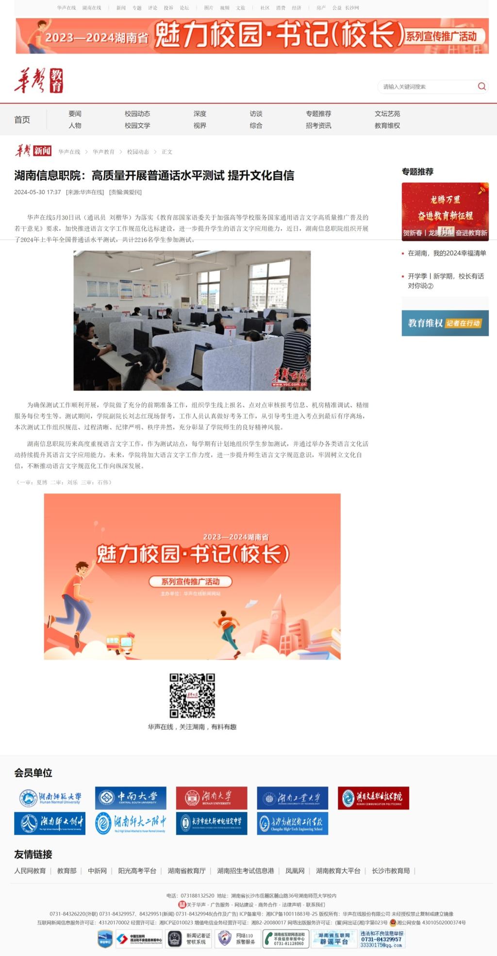 5月30日,华声在线发布《湖南信息职院:高质量开展普通话水平测试 提升文化自信》