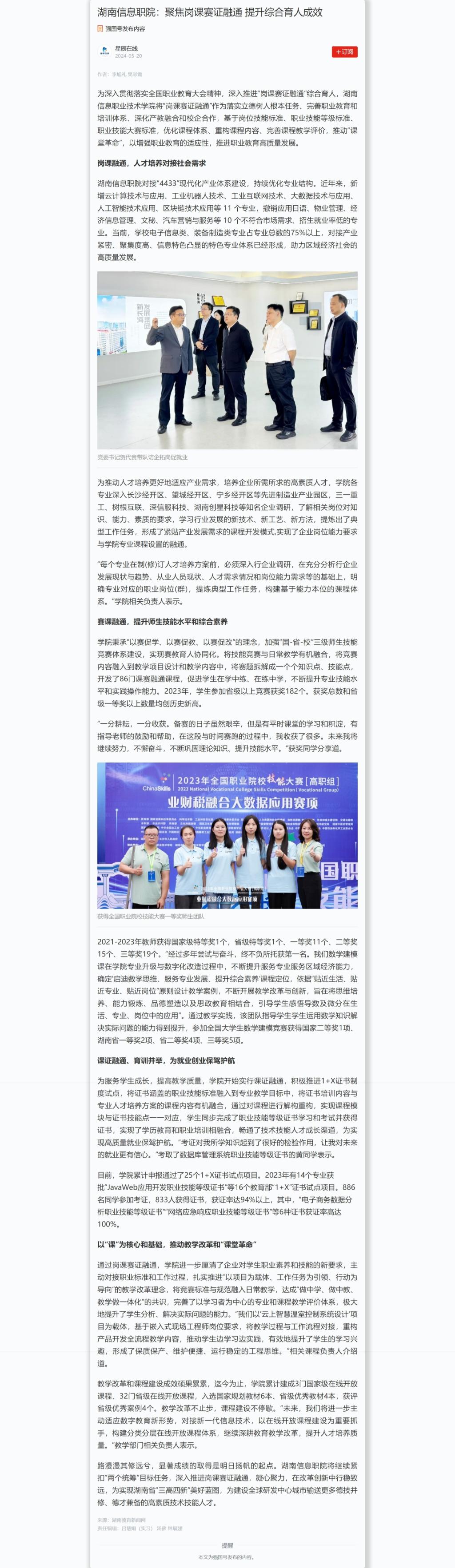 5月20日,学习强国发布《湖南信息职院:聚焦岗课赛证融通 提升综合育人成效》。