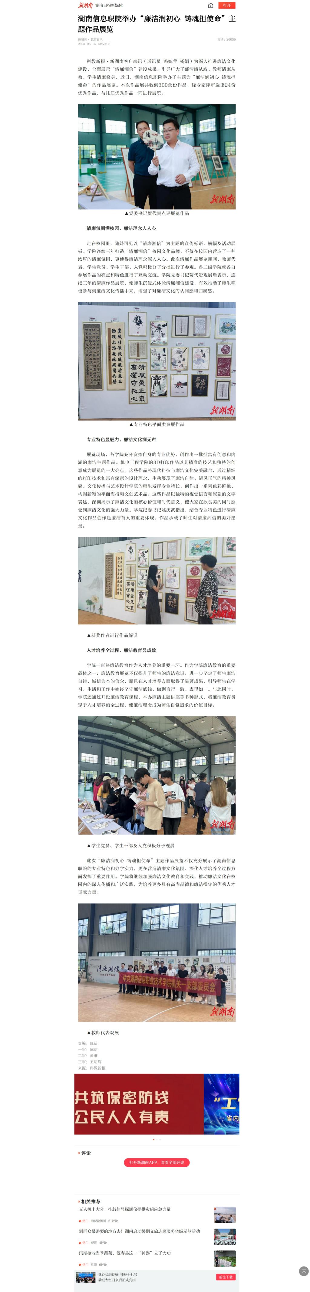 6月14日,新湖南发布《湖南信息职院举办“廉洁润初心 铸魂担使命”主题作品展览》