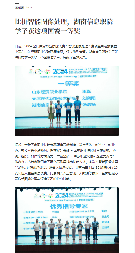 7月24日,潇湘晨报发布《比拼智能图像处理,湖南信息职院学子获这项国赛一等奖》