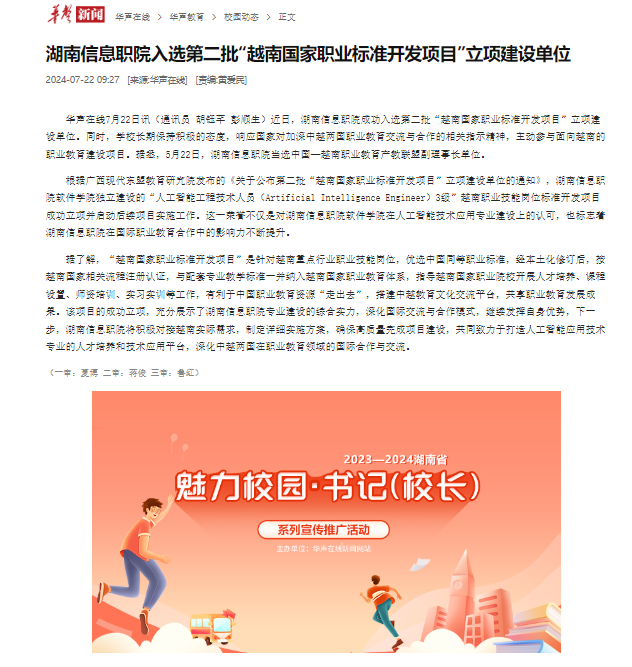 7月22日,华声在线发布《湖南信息职院入选第二批“越南国家职业标准开发项目”立项建设单位》