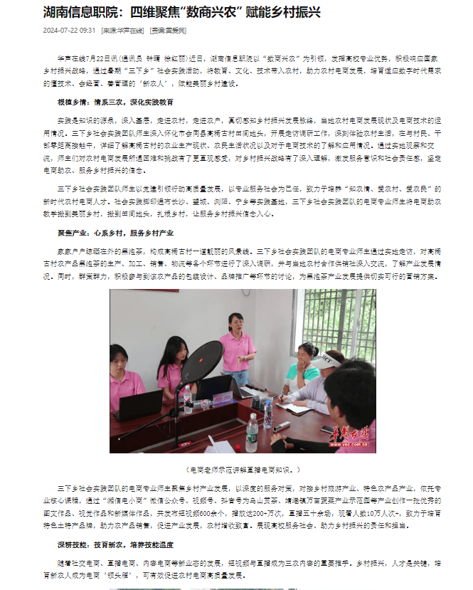 7月22日,华声在线发布《湖南信息职院:四维聚焦“数商兴农” 赋能乡村振兴》